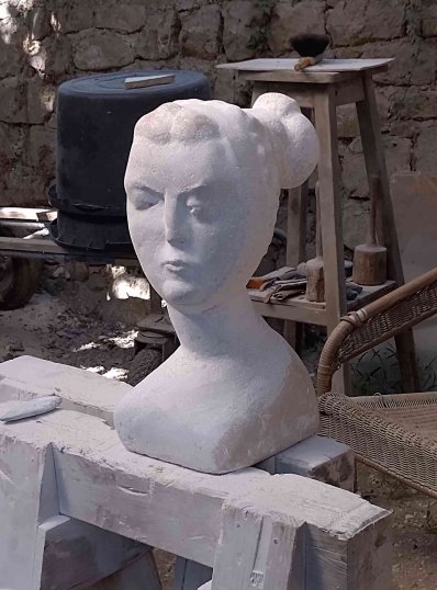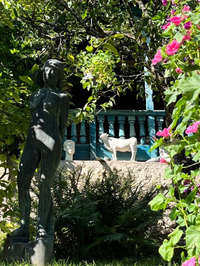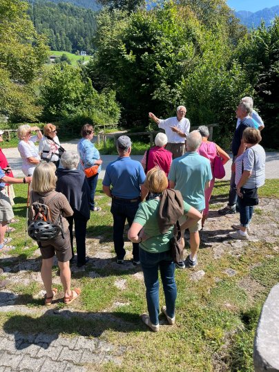 Doch dass sie ein veritabler Zaubergarten empfangen würde mitsamt wunderbar eingefügter Kunstwerke, damit hatten die wenigsten gerechnet. Zudem führte Gerhard Passens humorvoll durch seinen Künstlergarten. „Ich habe keine Blumen“, stellte er gleich zu Anfang klar. Dafür gibt es üppiges Grün und ein trotz der schwierigen Hanglage durchdacht angelegten Garten. Zwischen dem Grün tauchen die Kunstwerke auf und Passens erzählt von ihrer Entstehung und seinen Gedanken dahinter. Er führt durch sein Atelier und seinem überdachten Arbeitsplatz, den er sich so hergerichtet hat, damit er dort seine schweren Steinarbeiten ausführen kann. Denn das Bildhauern kann der ehemalige Fachlehrer und Schulleiter der Schnitzschule nicht lassen.