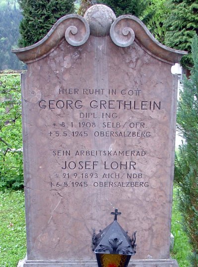Nr. 49 Dipl. Ing. Georg Grethlein, 37 Jahre aus Selb, Betriebsführer der größten Baufirma am Obersalzberg, erhielt von der amerikanischen Militärregierung noch am Tag des Einmarsches den Auftrag, für Ruhe und Ordnung am Obersalzberg zu sorgen. Josef Lohr, sein Beifahrer aus Aich, wurde am Tag darauf von einem betrunkenen französischen Soldaten in den Bauch geschossen, an dessen Folgen er im Krankenhaus verstarb. Grethlein, der ihm zu Hilfe eilen wollte, erhielt einen tödlichen Kopfschuss. Laut kath. Sterbebuch (Nr. 97) verschied Lohr am 5. Mai um 20:00 Uhr, somit ist der Todestag, 6.5., auf dem einzig noch vorhandenen Grabstein nicht ganz richtig.