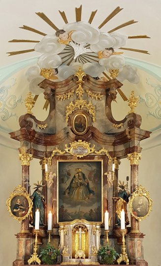 Seitlich des Gnadenbildes stehen der heilige Josef mit der Lilie und Joachim, Marias Vater, mit der Hirtenschaufel. Im Auszug des Altars, ganz oben, ist ein Ovalbild mit Anna, Marias Mutter, beim Unterweisen ihrer Tochter zu sehen. Die Bilder an den Außensäulen zeigen in schönen Rokokorahmen auf der linken Seite den heiligen Nikolaus von Tolentino (+1305) und Petrus Forerius (+1640).