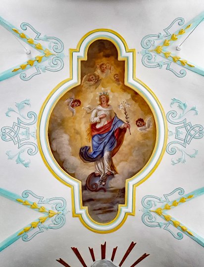 Im Deckenbild ist die von Engelputten umschwebte Maria mit weißer Lilie, dem Symbol der Reinheit, dargestellt. Das Zertreten der Schlange zu ihren Füßen symbolisiert den Sieg über das Böse.