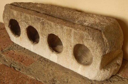Begibt man sich beim Eingang im Kreuzgang Berchtesgaden gleich nach rechts, fällt sogleich ein massiger grauer Quader auf mit eigenartigen vier gleichgroßen kreisrunden konisch zulaufenden Vertiefungen an der Längsseite.
